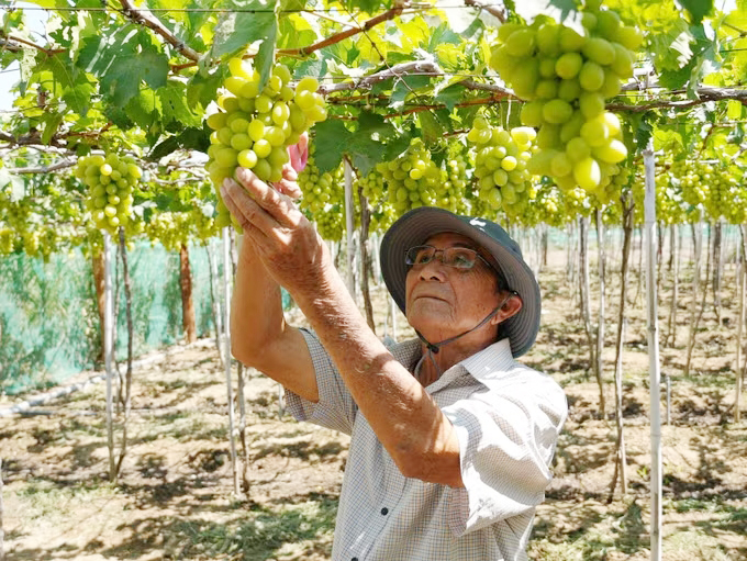 Ông Nguyễn Văn Mọi (xã Ninh Phước, Khánh Hòa) chăm sóc vườn nho xanh NH01-48 đạt tiêu chuẩn VietGAP.